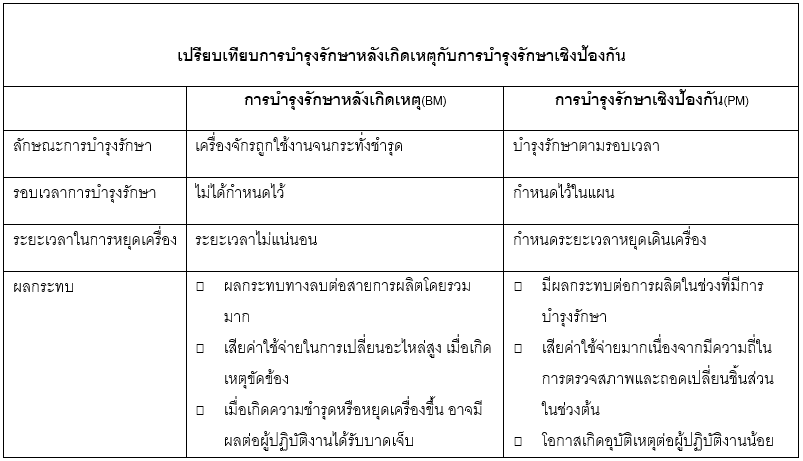 การวางแผนบำรุงรักษามีบทบาทสำคัญในการป้องกันและลดปัญหาเครื่องจักรชำรุดเสียหาย   ดังนั้นผู้ประกอบการควรพิจารณาปัจจัยและประเมินผลกระทบการบำรุงรักษาหลังเกิดเหตุขัดข้อง(Breakdown Maintenance)เพื่อลดความสูญเสียโอกาสทางธุรกิจ หากปราศจากแผนการบำรุงรักษาแล้วความเสียหายที่เกิดจากเครื่องจักรขัดข้องและค่าใช้จ่ายการซ่อมบำรุงจะสูงมาก ซึ่งการดำเนินการอย่างมีประสิทธิผลควรคำนึงถึงความเหมาะสมด้วยการจัดทำแผนเพื่อลดความสูญเสียและยืดอายุการใช้งาน  แนวโน้มการดำเนินธุรกิจถูกปรับเปลี่ยนไปจากรูปแบบเดิมที่มุ่งใช้แรงงานสู่ความเป็นอัตโนมัติมากขึ้น  ทำให้ระบบบำรุงรักษามีบทบาทสนับสนุนการดำเนินงานมากขึ้น   โดยเฉพาะการบำรุงรักษาเชิงคาดการณ์(Predictive Maintenance)และการบำรุงรักษาเชิงป้องกัน(Preventive Maintenance) เช่น การใช้อุปกรณ์  V-Starter Smart Vibration Analyzer   วิเคราะห์ความสั่นสะเทือนเพื่อนำข้อมูลมาประเมินความน่าเชื่อถือระบบและคาดการณ์แนวโน้มการชำรุดของอุปกรณ์หรือชิ้นส่วนสำคัญ